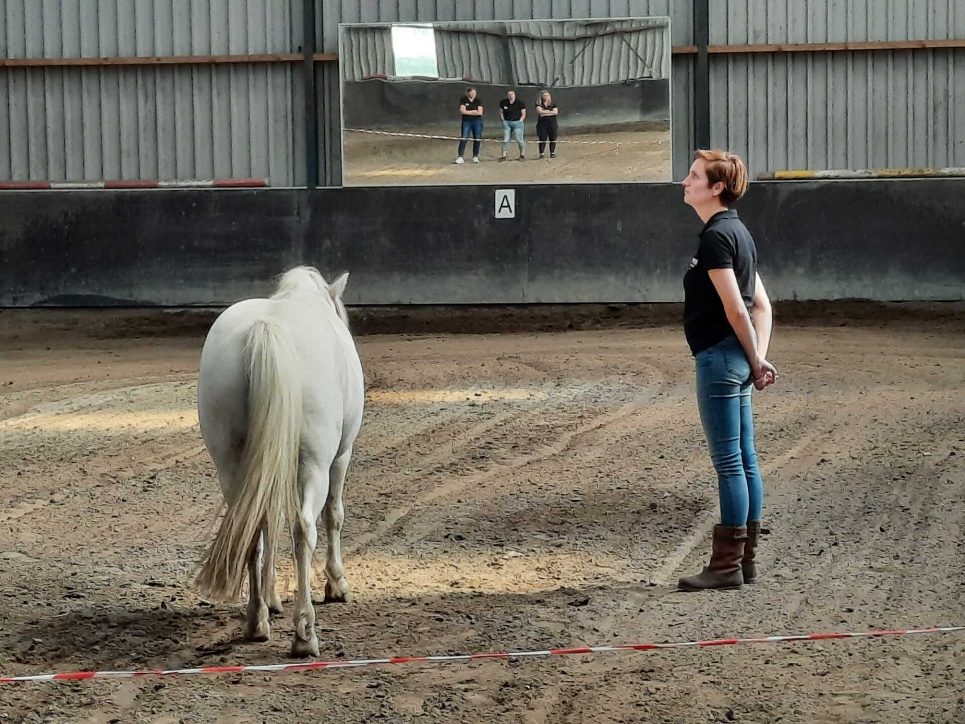 Wij vinden het essentieel dat je weet wat voor dier een paard is en welke (natuurlijke) gewoonten en behoeften het paard heeft. En wij vinden het zeker zo belangrijk dat je bewust bent van je zelfbeeld en welke processen er bij jezelf spelen. Om dit te leren werken we niet alleen vanuit cognitieve kaders, we besteden net zo veel aandacht aan lichaamsgericht werken.